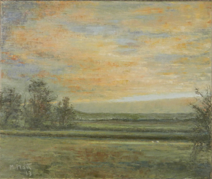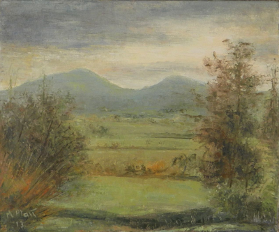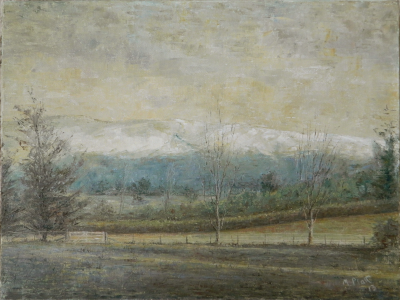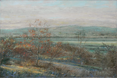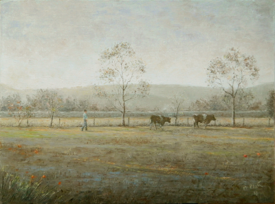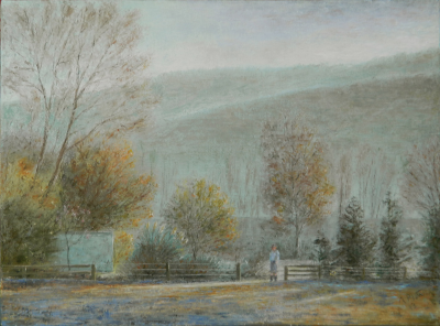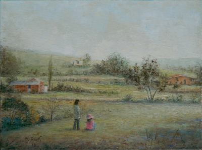 We lived on a small farm on the Taieri for a few years, and many of the paintings are of or from the farm.The ambience motif is seen in many of the paintings. "Taieri Morning" features our neighbour Trav's house; we often saw the low mist in the mornings. "Wild Poppies" shows our front paddock beside the drive. The poppies grew there uncultivated. "Cold Snap" was a view from our lounge window.
